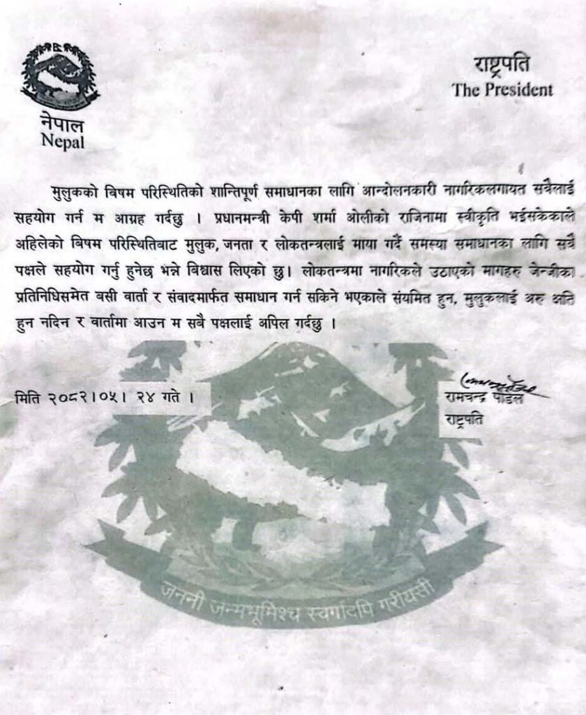 २४ भदौ, काठमाण्डौं । राष्ट्रपति रामचन्द्र पौडेलले संयमित हुन र वार्तामा आउन अपिल गरेका छन्।