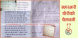 ४ असोज, नेपालगन्ज । ‘होसियार होजाओ अब इस मोहल्ले कि बारी है । २० लोग आएँगे चोरी कर्ने । जागो जितना जाग्ना हो । चोरी करने आएंगे बचाओ सब अपना मोहल्ला । चोरोँ खौफ दिआएँगे तुम सबको । जागो हच्छे से, चोरी होगी । अब तुम्हारे मोहल्ले कि बारी है ।’ कुनै हिन्दी एक्सन फिल्मको … Continue reading चोरी हुने दिन तोकेरै पर्चा टाँसिएपछि नेपालगन्जवासी आतंकित