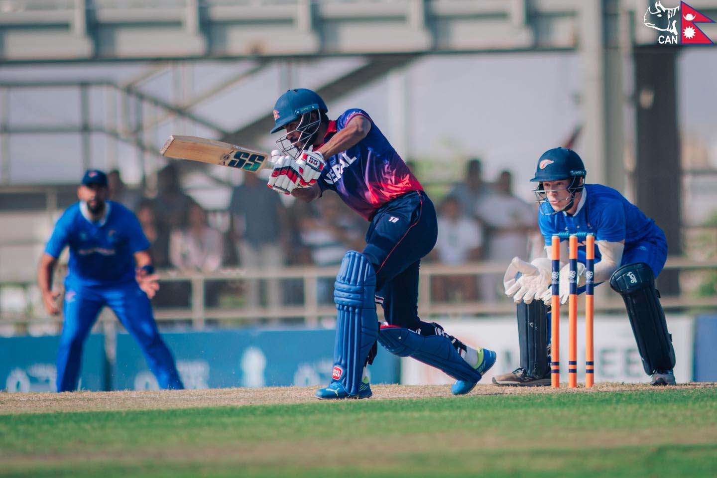 नेपालका दुई खेलाडीले अर्धशतक प्रहार गरे । आसिफ शेख ४१ बलमा ६९ र दीपेन्द्रसिंह ऐरीले ३३ बलमा ५३ रनको योगदान दिए । कुशल भुर्तेल १७ र आरिफ शेख ९ रनमा आउट भए । कप्तान रोहित पौडेल १२ बलमा २१ र लोकेश बम १२ बलमा ३९ रनमा अविजित रहे ।