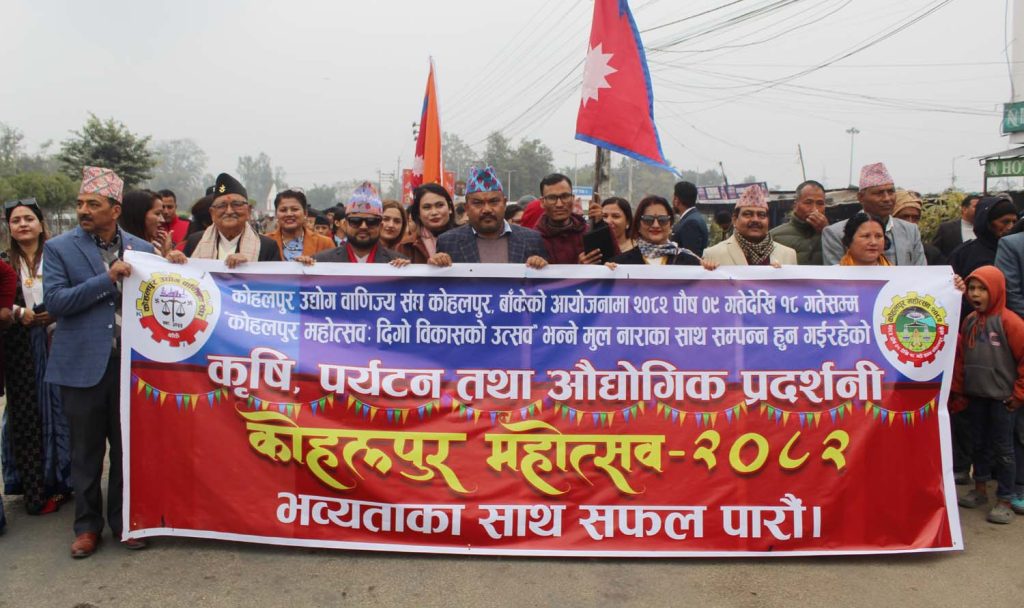 ९ पुष, कोहलपुर । बाँकेको कोहलपुरमा आजदेखि सुरु भएको कोहलपुर महोत्सव-२०८२ भव्य रूपमा उद्घाटन गरिएको छ। विशेष समारोहबीच नेपाल उद्योग वाणिज्य महासंघका केन्द्रीय अध्यक्ष चन्द्रप्रसाद ढकालले महोत्सवको औपचारिक उद्घाटन गरेका हुन । कोहलपुर न्यूरोडमा सञ्चालन भइरहेको महोत्सवको उद्घाटन समारोहमा वैदिक विधिअनुसार स्वस्ति वाचन सहित दिप प्रज्वलन गरिएको थियो।
