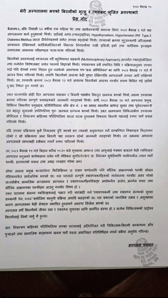 मानसिक दबाब र असुरक्षाको वातावरणका कारण अस्पतालका केही सेवाहरू प्रभावित हुन सक्ने जनाउँदै अस्पतालले चिकित्सक–बिरामी सम्बन्धमा आँच पुर्याउने र सामाजिक सद्भाव बिगार्ने गतिविधि नगर्न सबैसँग अपिल गरेको छ।